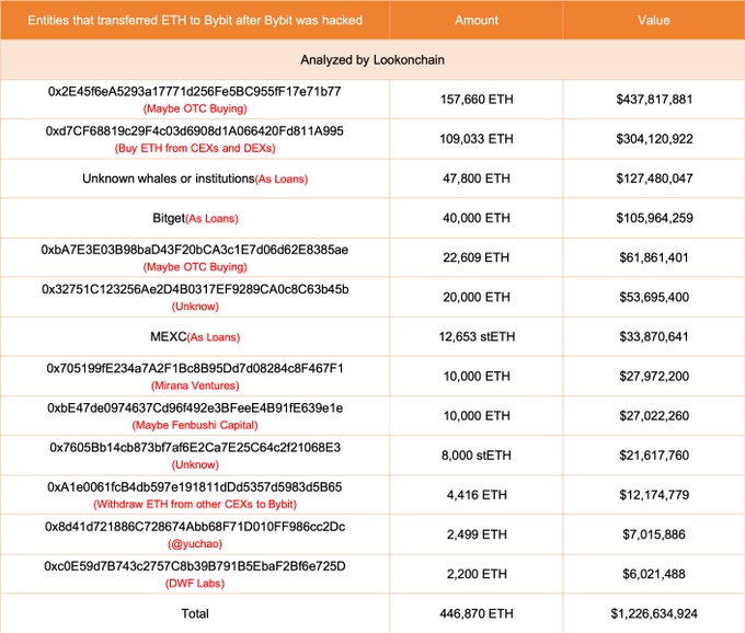 Sau vụ tấn công, Bybit đã thu về khoảng 446.870 ETH (1,23 tỷ USD). Sàn đã sử dụng kết hợp các khoản vay, tiền gửi từ nhà đầu tư lớn và mua ETH trực tiếp để bổ sung khoản nắm giữ.