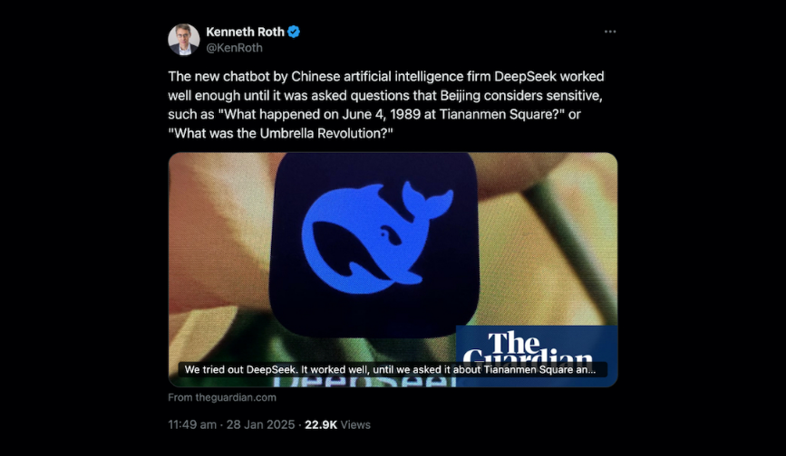 DeepSeek, giống như các mô hình AI khác của Trung Quốc như Baidu Ernie hay ByteDance Doubao, bị kiểm duyệt nội dung chính trị. Nó từ chối trả lời các câu hỏi nhạy cảm, như sự kiện Thiên An Môn 1989, với lý do đảm bảo câu trả lời “hữu ích và vô hại”. Điều này có thể làm giảm sức hấp dẫn của DeepSeek bên ngoài Trung Quốc.