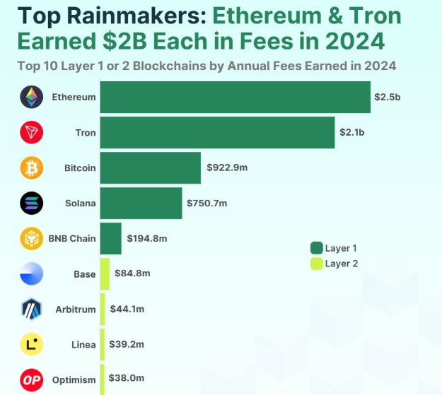 Ethereum thu về 2,48 tỷ USD từ phí trong năm 2024, nhiều nhất trong số các blockchain, theo sau là Tron với 2,15 tỷ USD. Bitcoin đứng thứ ba, thu về 922 triệu USD, theo báo cáo ngày 21 tháng 1 của CoinGecko.