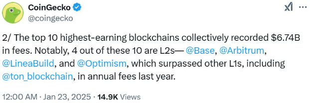 Báo cáo của CoinGecko đã xem xét các khoản phí gas mà các blockchain thu được từ ngày 1 tháng 1 năm 2023 đến ngày 31 tháng 12 năm 2024.
