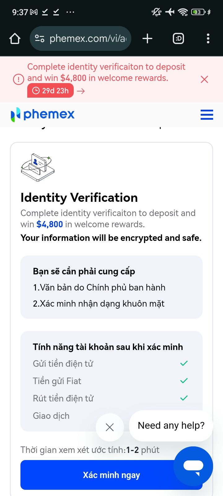 Phemex yêu cầu xác minh danh tính để đảm bảo an toàn và tuân thủ các quy định: