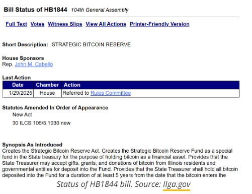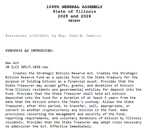 Dự luật HB1844, do Hạ nghị sĩ bang Illinois John Cabello đề xuất, đề nghị thành lập một quỹ dự trữ Bitcoin chiến lược như một “quỹ đặc biệt trong kho bạc bang nhằm mục đích giữ Bitcoin như một tài sản tài chính.”