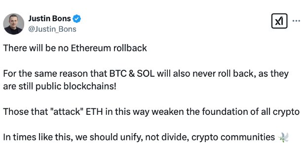 Phó chủ tịch blockchain của Yuga Labs, với tài khoản X là 0xQuit, cho biết tác động của một đợt rollback sẽ “lớn hơn nhiều so với 1,5 tỷ USD.”