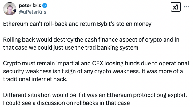 Trong khi đó, trong một buổi X Spaces vào ngày 22/2, CEO Bybit Ben Zhou đã giữ thái độ trung lập hơn khi được hỏi liệu ông có ủng hộ việc rollback Ethereum hay không.