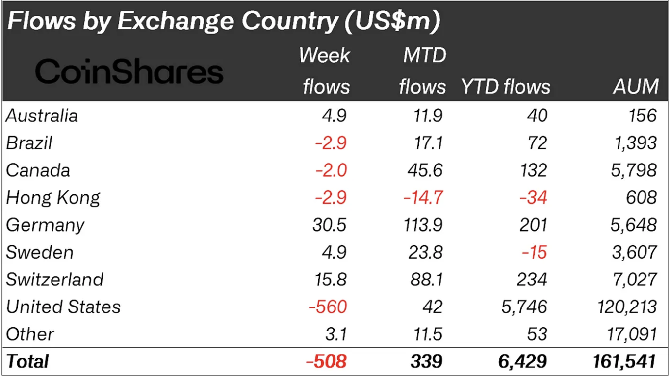 Trái ngược với sự lạc quan bùng nổ tại thị trường Mỹ, theo CoinShares, Mỹ là khu vực có tâm lý tiêu cực nhất trong tuần trước, với dòng tiền rút tổng cộng 560 triệu USD.