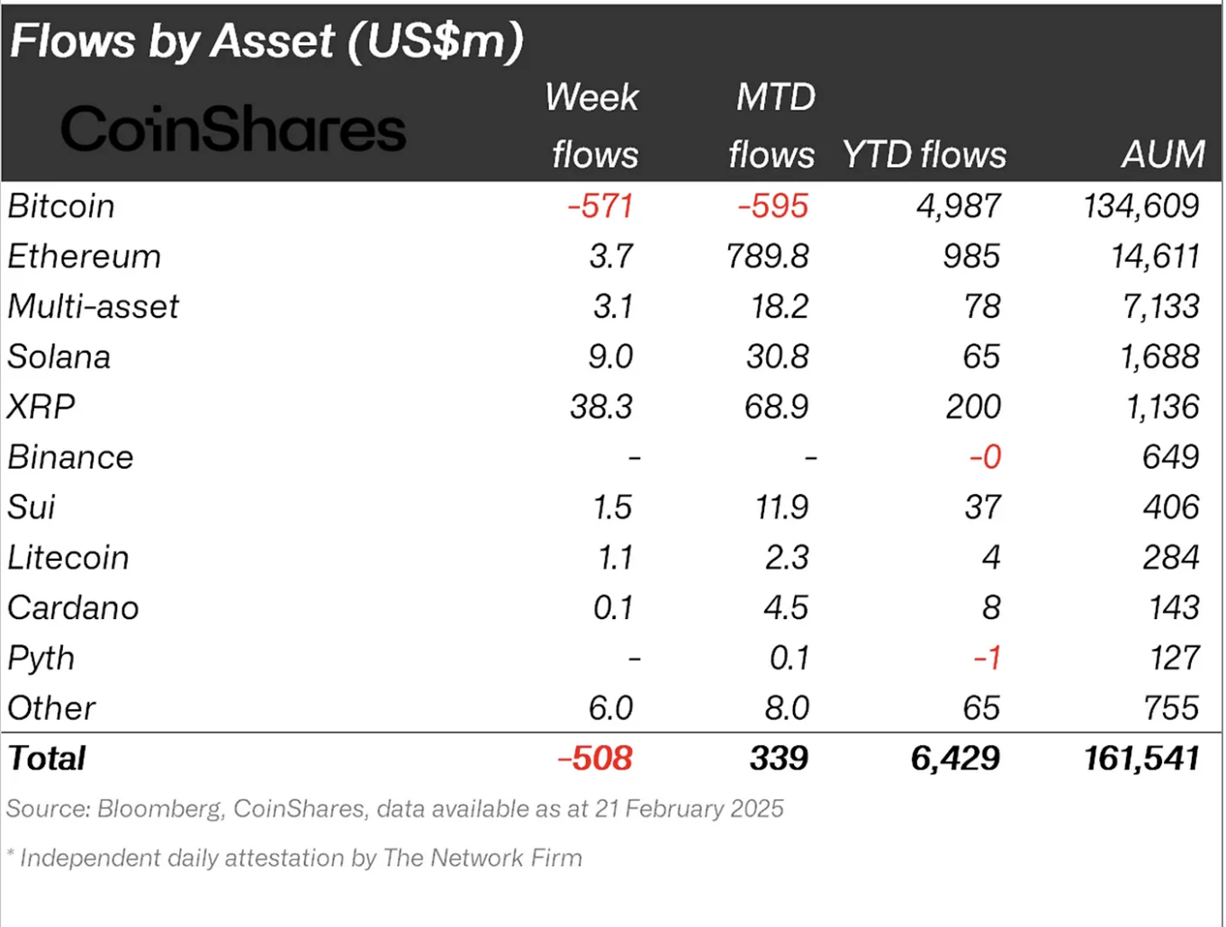 Các sản phẩm đầu tư tiền điện tử đã chứng kiến dòng tiền rút đáng kể trong tuần trước, tổng cộng lên tới 508 triệu USD, khi các nhà đầu tư phản ứng trước những bất ổn kinh tế và quy định đang diễn ra.